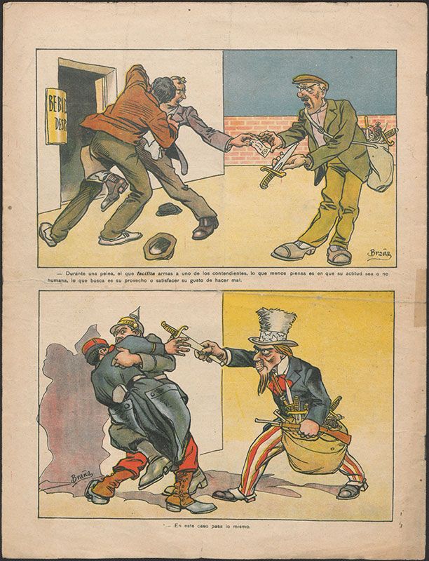 Interessant ist, dass Zeichner und Herausgeber über die humane, pazifistische Aussage eine sehr neutrale Position zu den Kriegsparteien Frankreich, Russland und Deutschland einnehmen. Die dritte Zeichnung ist allerdings anti US-amerikanisch zu werten.